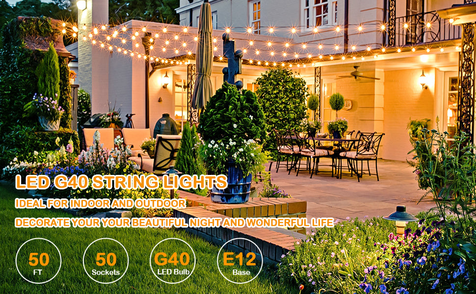 🔗 Connectable Up to 28 Sets – Includes 25 + 2 extra G40 bulbs spaced 2ft apart for full 50ft coverage. Extendable for larger setups.