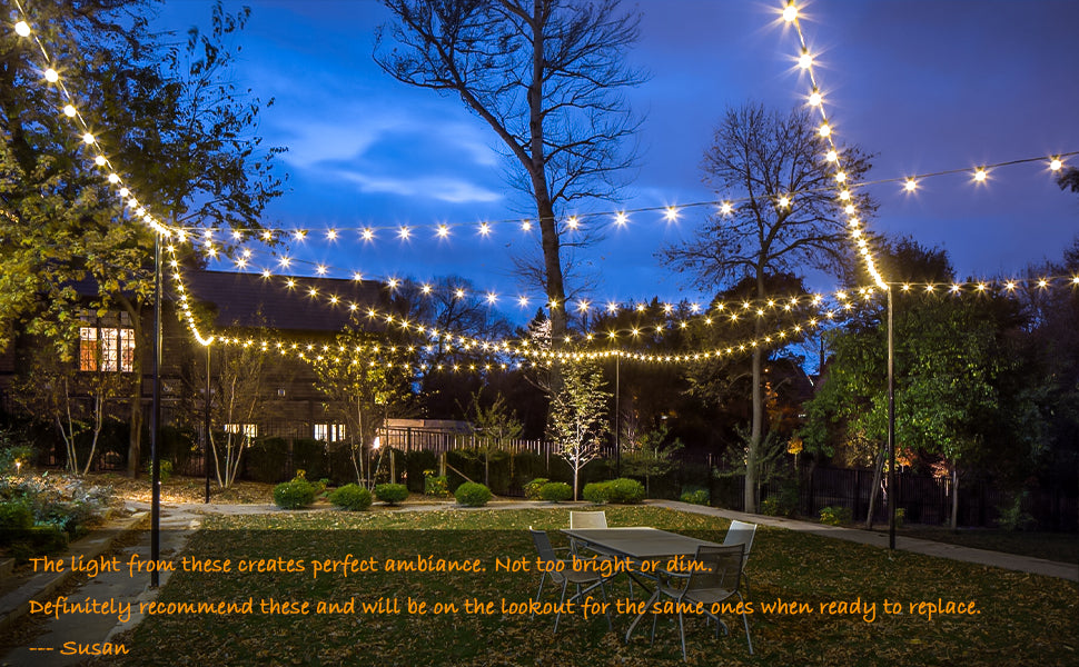 This string light set is just perfect for us. We used it with lighting poles and some up-lights, along with an outdoor furniture set and fireplace that we also found on Amazon. I had also purchased a suspension wire kit, but decided that I didn’t need it for the short runs that we had. The 50-ft length was enough to allow me to double the strands, which makes it look a little neater. We really like the appearance of this setup.